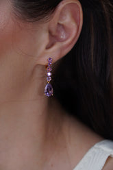 Each pair of royal lilac dangle earrings features a teardrop gemstone. The stones are carefully matched. They shimmer with a subtle, radiant glow. The elongated profile draws attention to your neckline. You will turn heads at any event.